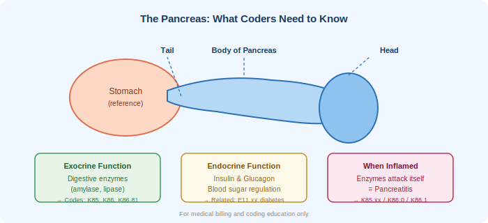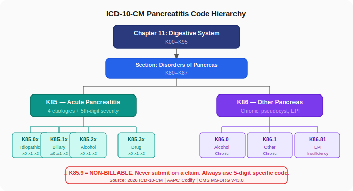 | Quick Summary: The short version: Pancreatitis lives under K85 (acute) and K86 (chronic/other) in Chapter 11 of ICD-10-CM. Every billable code needs five characters. K85.9 is a dead end — never submit it on a claim. The fifth digit tells the payer how serious things got. That’s the whole game. |