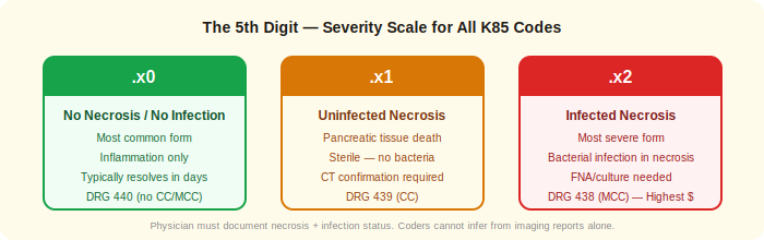 Before we dive into individual codes, you need to understand the fifth-digit extension that appears on every K85 code. This is where a lot of billers stumble, and it’s also where a lot of DRG value gets left on the table.