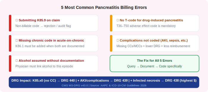 In practice, pancreatitis claims have a predictable set of errors that show up on audits and in denials. Here are the five most common — and what to do instead.